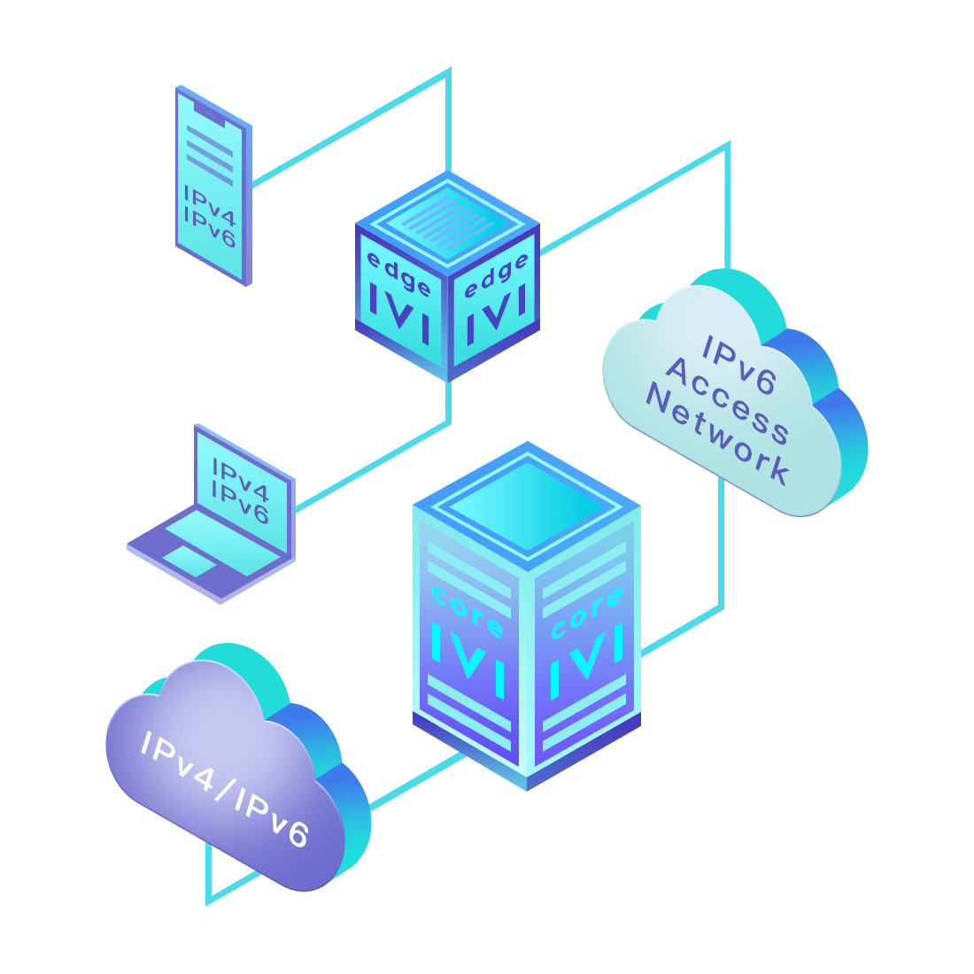 對正在進行IPv6整體升級規(guī)劃的運營商,應用IPv6升級方案2.5,通過IVI無狀態(tài)翻譯技術和純IPv6接入網絡,為雙棧客戶端和雙棧服務器提供連通服務。